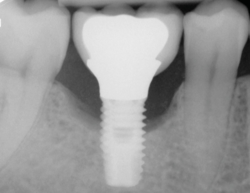 Les critères qui permettent de diagnostiquer une péri-implantite sont aujourd’hui bien établis, les voici rappelés : signes cliniques d’une inflammation péri-implantaire (gonflement, rougeur, saignement au sondage et/ou suppuration) (fig. 1a), perte osseuse péri-implantaire au-delà de celle constatée après la cicatrisation « initiale » (fig. 1b), augmentation de la profondeur de poche au sondage en comparaison de la profondeur de poche identifiée lors de la mise en place de la restauration prothétique [2, 23]. En l’absence de documents radiographiques préexistants, une perte osseuse supérieure ou égale à 3 mm en association avec un saignement au sondage et une profondeur de poche au sondage supérieure ou égale à 6 mm permet également de poser le diagnostic de péri-implantite [23].