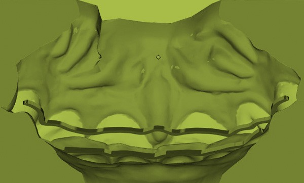 La prise d’empreinte peut être PVS ou numérique avec les caméras 3D actuelles (3Shape, Itero, 3M…). Une passerelle permet la création de la fiche de prescription avec possibilité d’extension des attelles 2 à 2 ou 3 à 3 ou 4 à 4, attelle maxillaire, mandibulaire ou les deux. La durée de la réalisation et de l’envoi par colis postal est de trois semaines. En cas de problème sur le dessin de l’attelle, en particulier l’encombrement par rapport à l’arcade mandibulaire pour les cas d’attelles maxillaires, le laboratoire envoie un mail avec un lien permettant de visualiser et confirmer le dessin avant la fabrication (fig. 7).