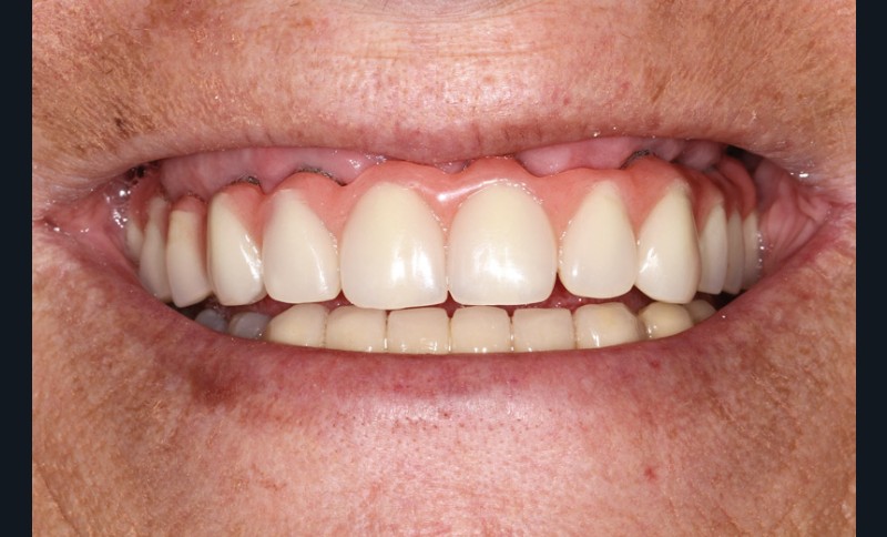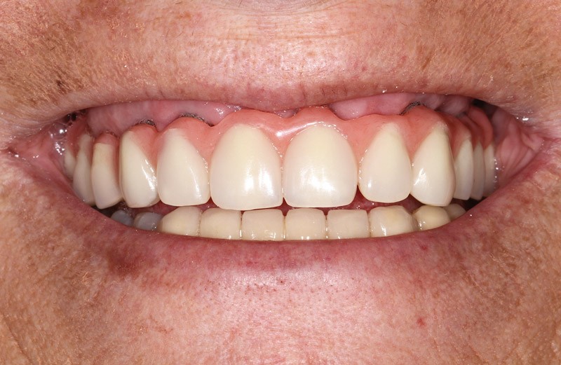 Lorsque la perte osseuse du patient est ample en direction verticale, la ligne de sourire, qu’elle soit haute ou basse, ne laisse apparaître que la gencive de la prothèse. La ligne de transition entre prothèse et gencive naturelle (LTPG) est sous-labiale, à l’abri du regard.