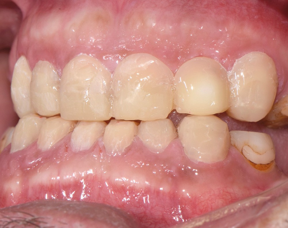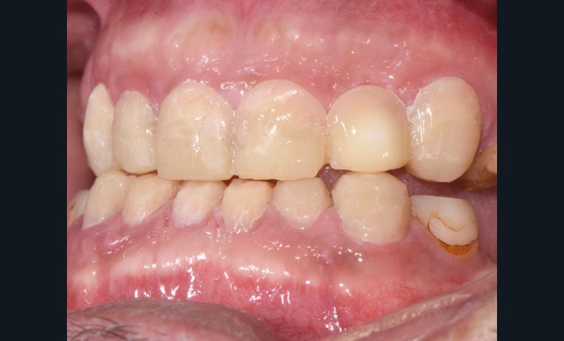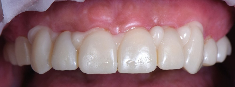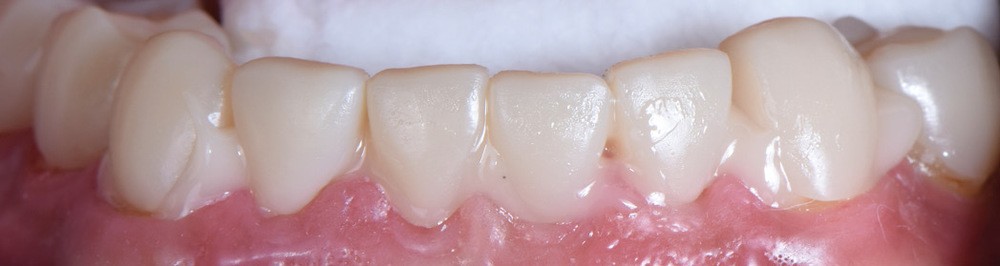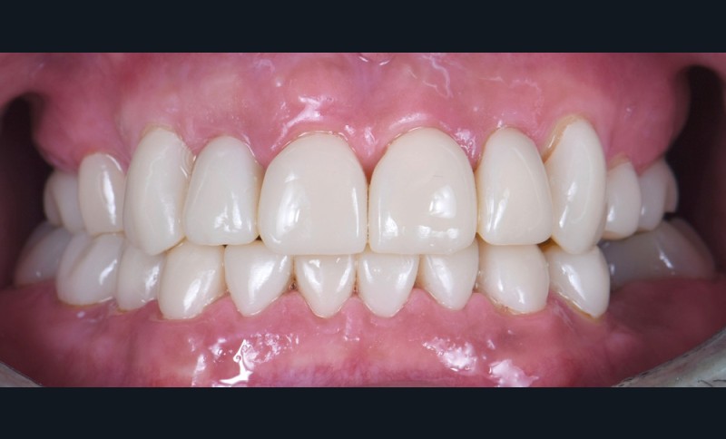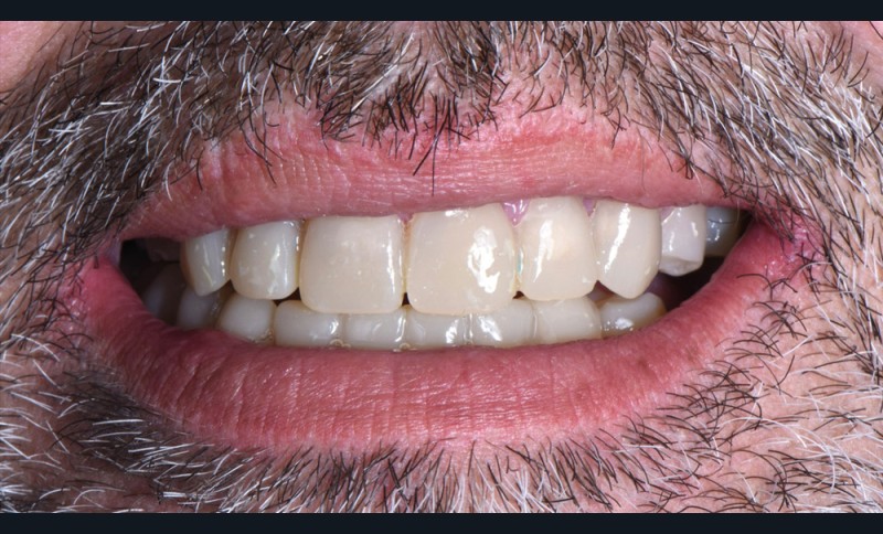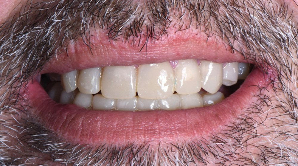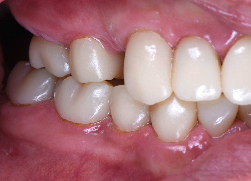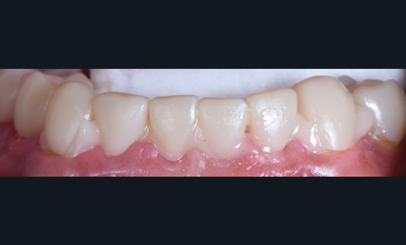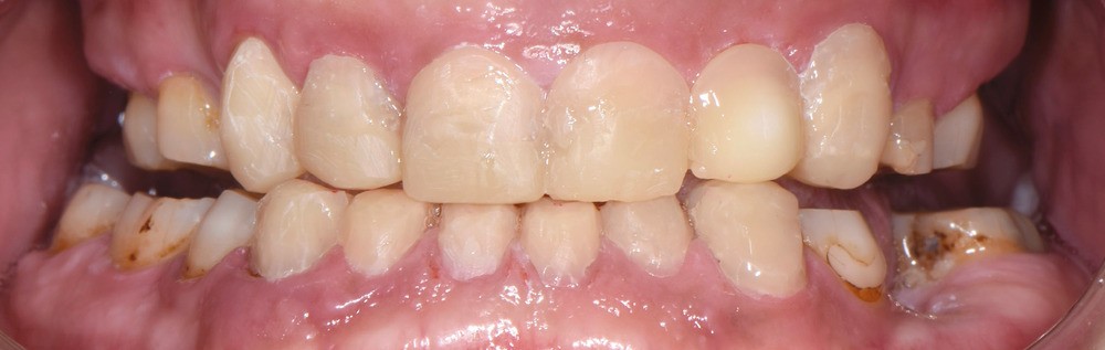 Au vu du contexte para-fonctionnel et de l’étendue de la perte tissulaire, des coiffes périphériques minimalement invasives ont été choisies afin de restaurer l’esthétique et la fonction. Actuellement, aucun consensus n’est fait sur le choix du matériau d’infrastructure à privilégier. Les matériaux hybrides usinables présentent des propriétés mécaniques, physiques et biologiques intéressantes en contexte d’usure sévère (e.g., module d’élasticité, résistance à la propagation de fêlures, facilité de réintervention). Une réhabilitation globale avec remontée de dimension verticale d’occlusion (DVO) par l’intermédiaire de coiffes composites renforcés en nano-céramiques est décrite.