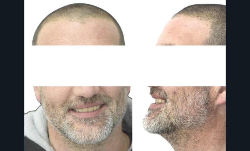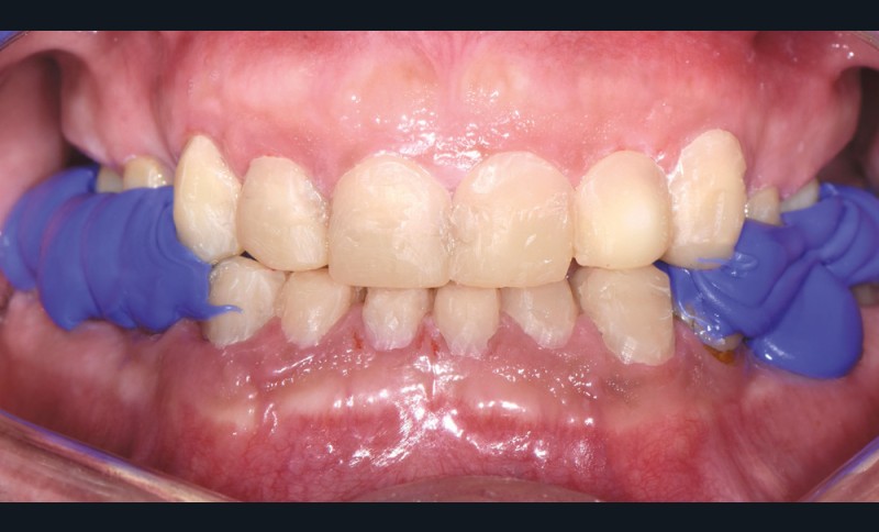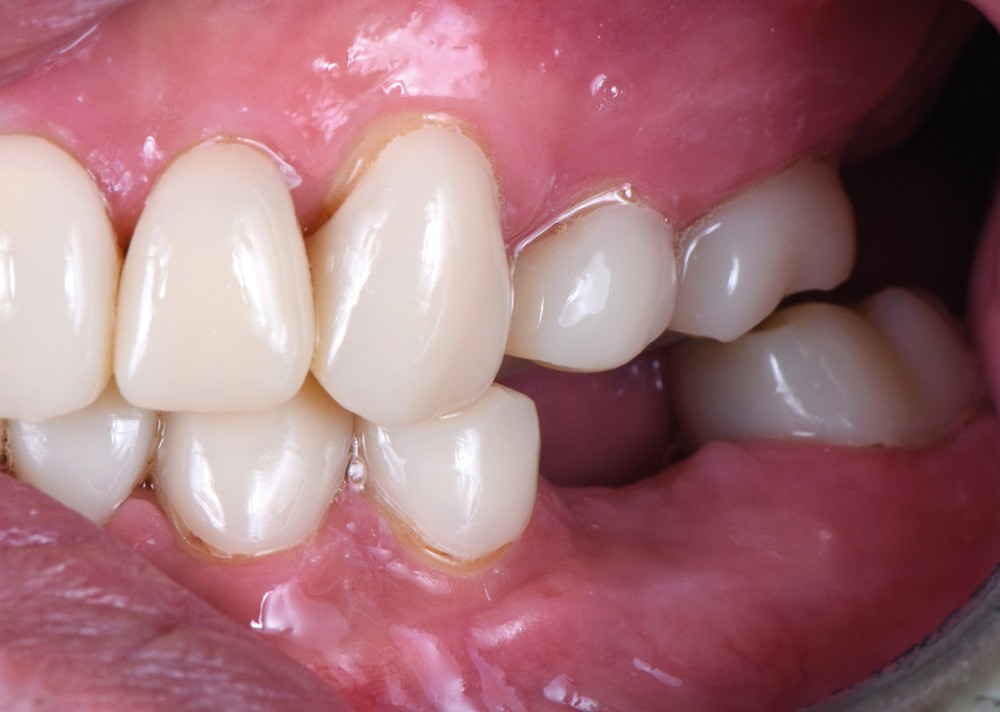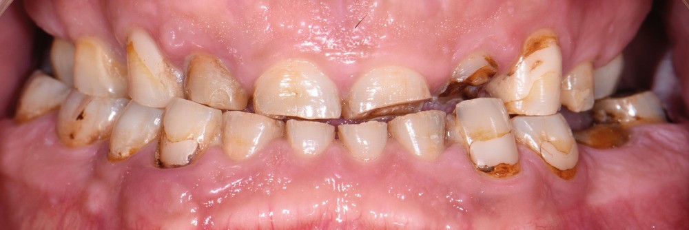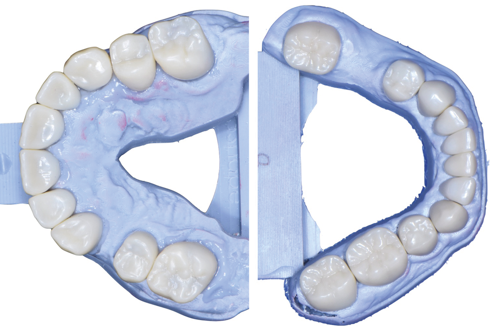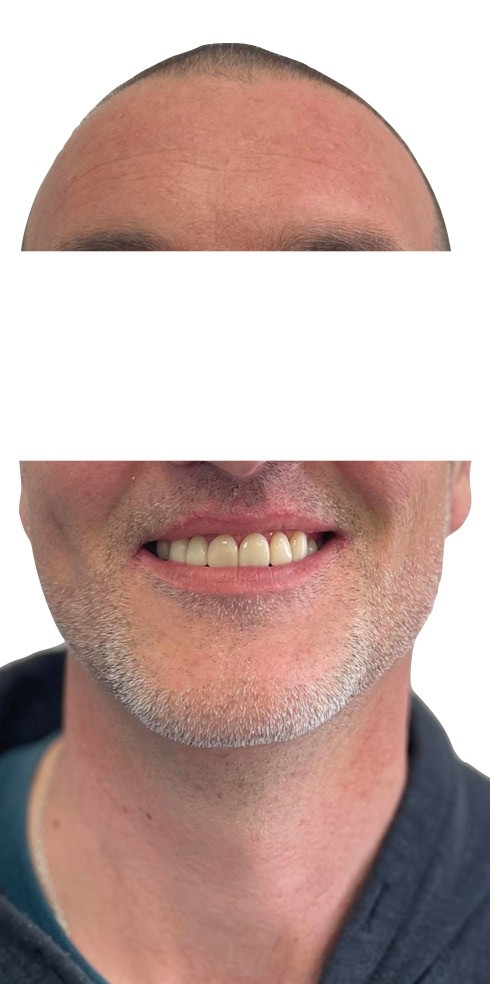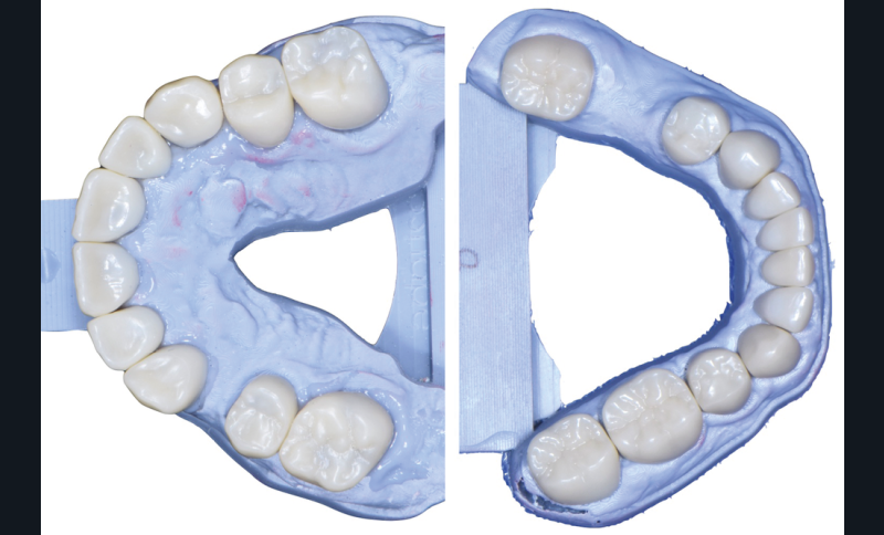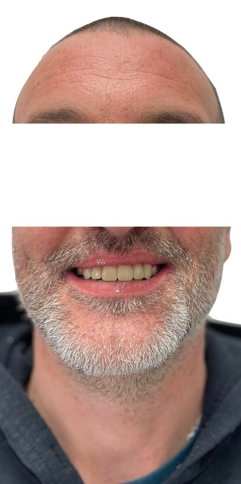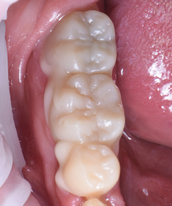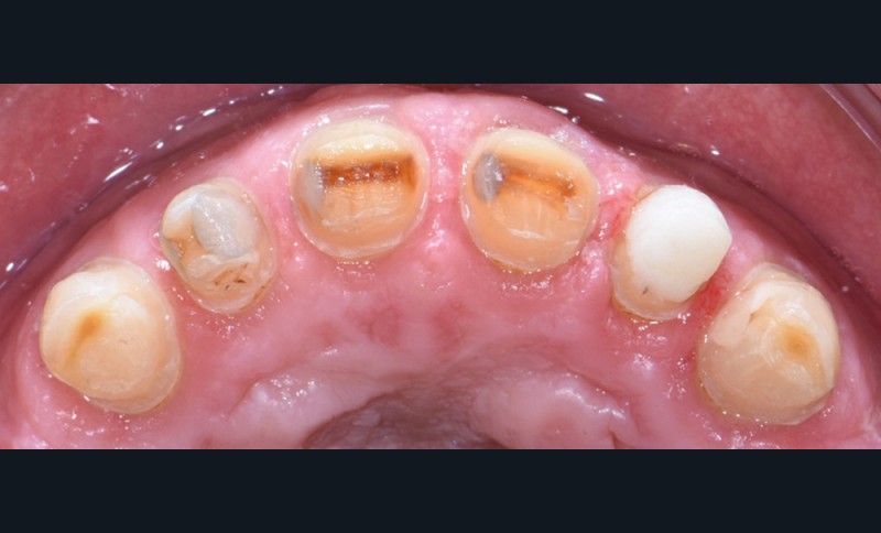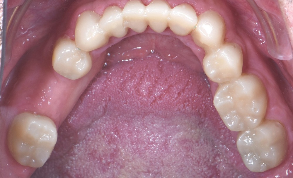 Au vu du contexte para-fonctionnel et de l’étendue de la perte tissulaire, des coiffes périphériques minimalement invasives ont été choisies afin de restaurer l’esthétique et la fonction. Actuellement, aucun consensus n’est fait sur le choix du matériau d’infrastructure à privilégier. Les matériaux hybrides usinables présentent des propriétés mécaniques, physiques et biologiques intéressantes en contexte d’usure sévère (e.g., module d’élasticité, résistance à la propagation de fêlures, facilité de réintervention). Une réhabilitation globale avec remontée de dimension verticale d’occlusion (DVO) par l’intermédiaire de coiffes composites renforcés en nano-céramiques est décrite.