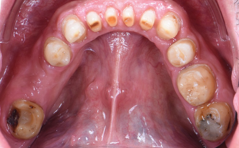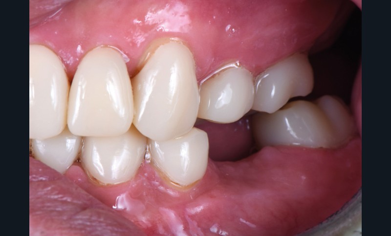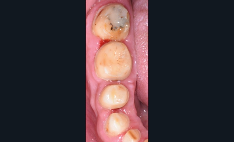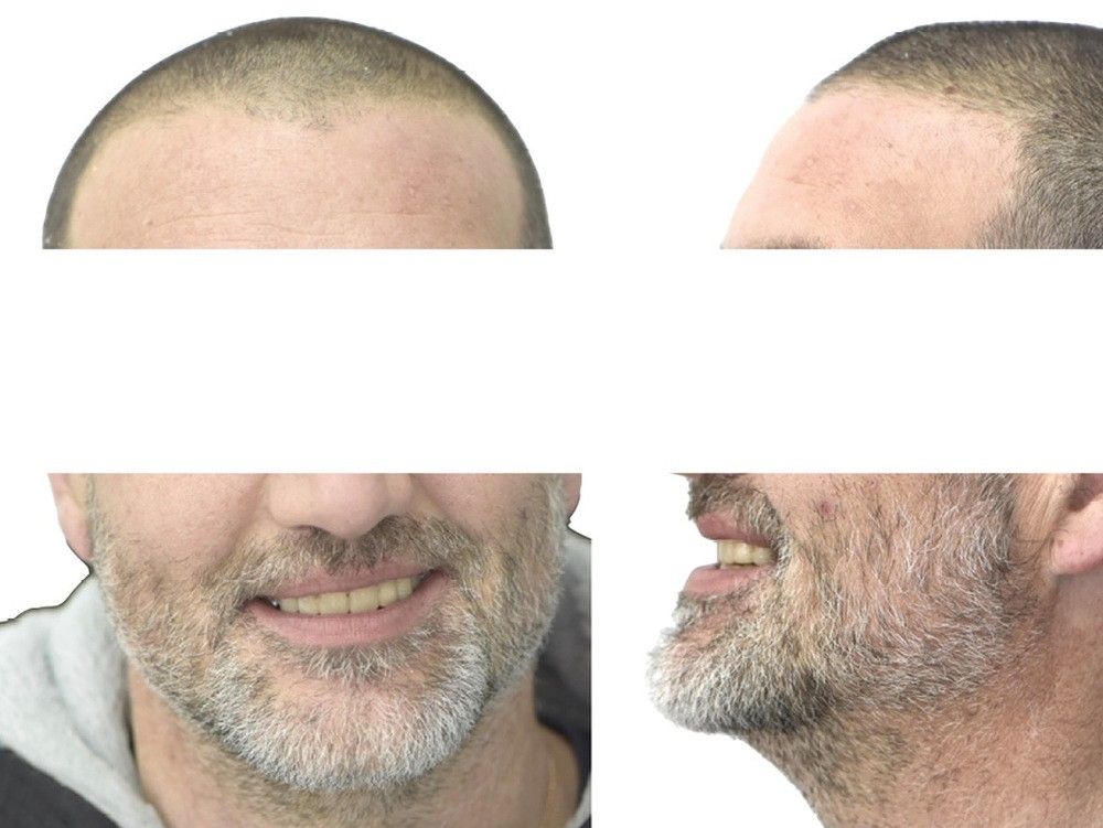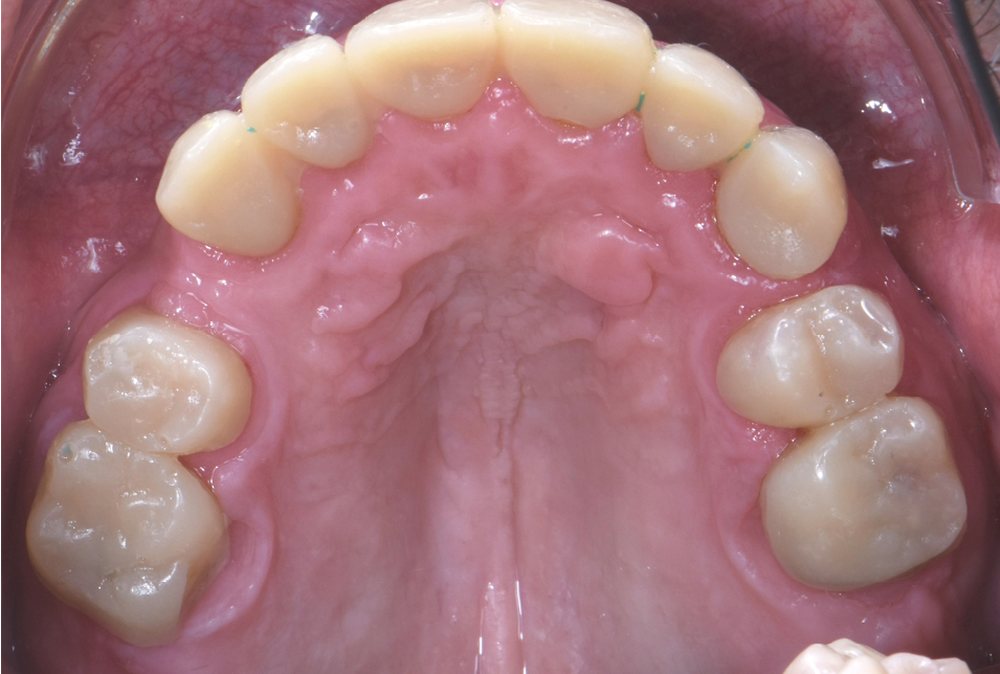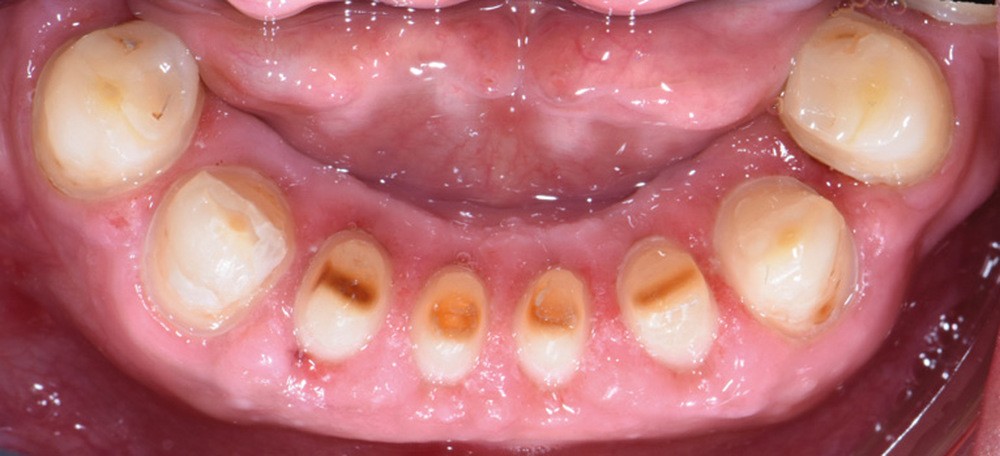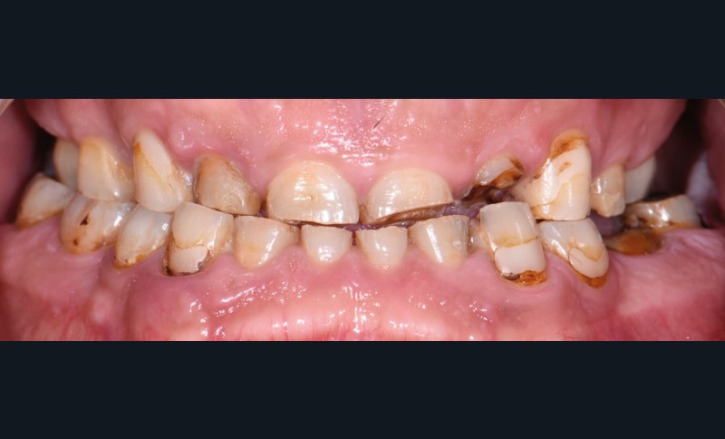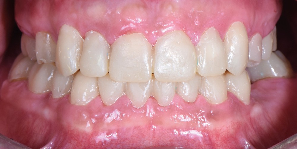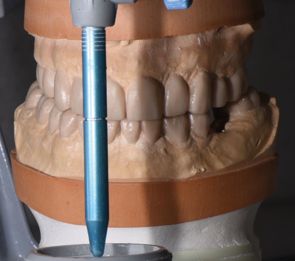 Au vu du contexte para-fonctionnel et de l’étendue de la perte tissulaire, des coiffes périphériques minimalement invasives ont été choisies afin de restaurer l’esthétique et la fonction. Actuellement, aucun consensus n’est fait sur le choix du matériau d’infrastructure à privilégier. Les matériaux hybrides usinables présentent des propriétés mécaniques, physiques et biologiques intéressantes en contexte d’usure sévère (e.g., module d’élasticité, résistance à la propagation de fêlures, facilité de réintervention). Une réhabilitation globale avec remontée de dimension verticale d’occlusion (DVO) par l’intermédiaire de coiffes composites renforcés en nano-céramiques est décrite.