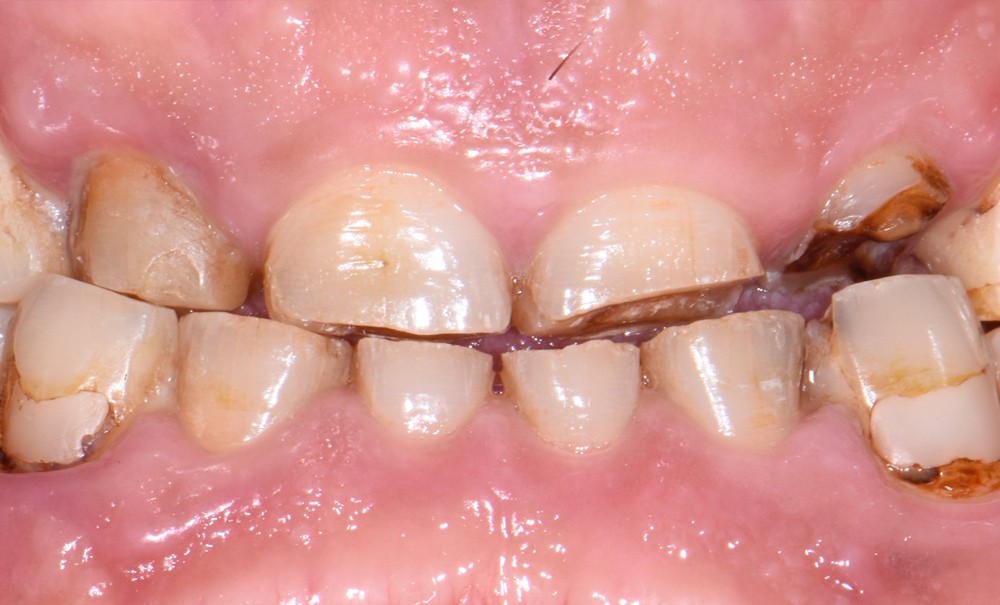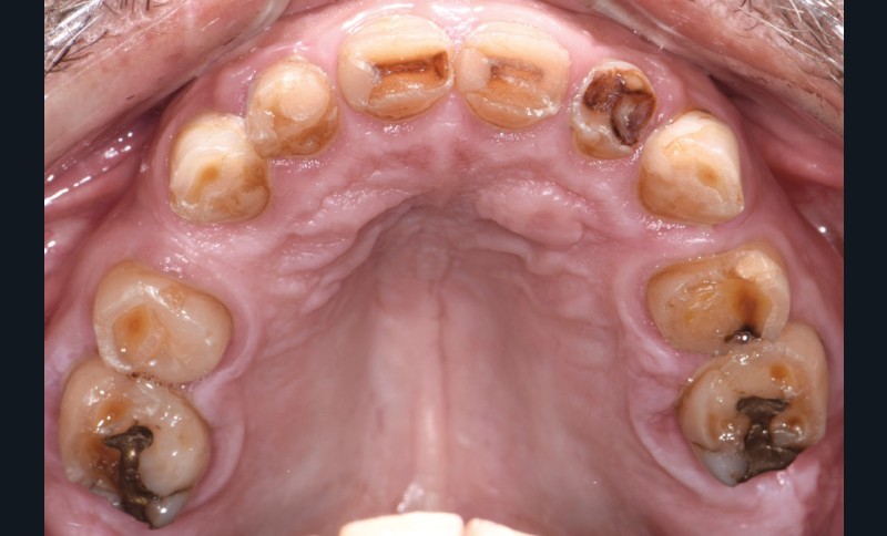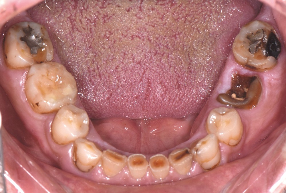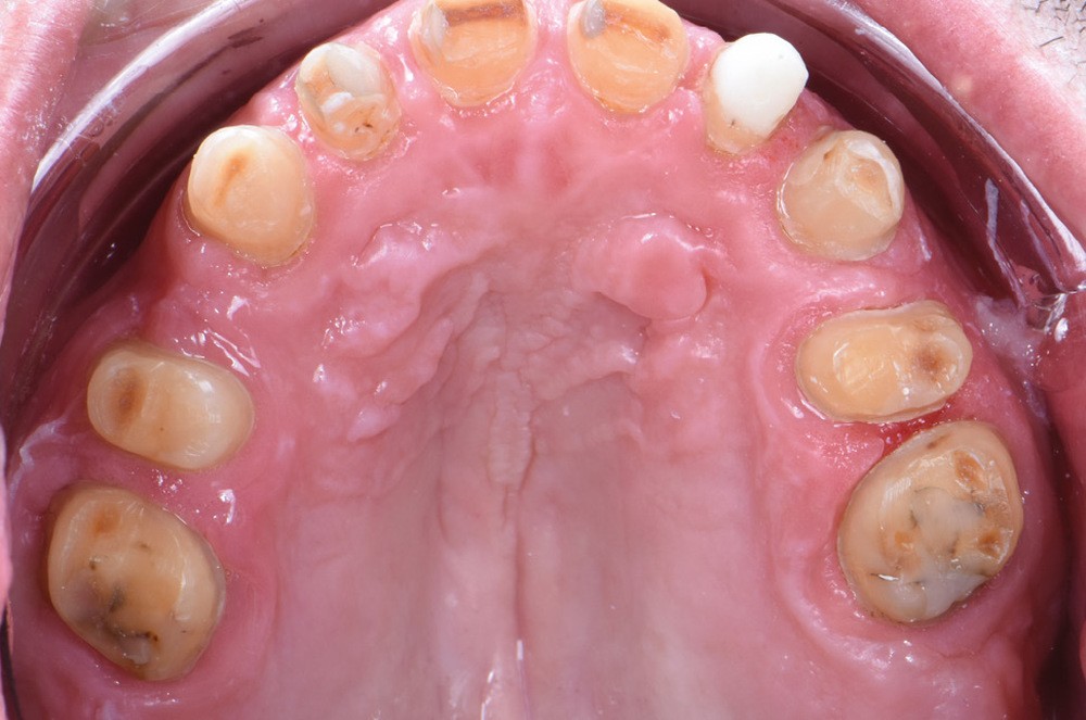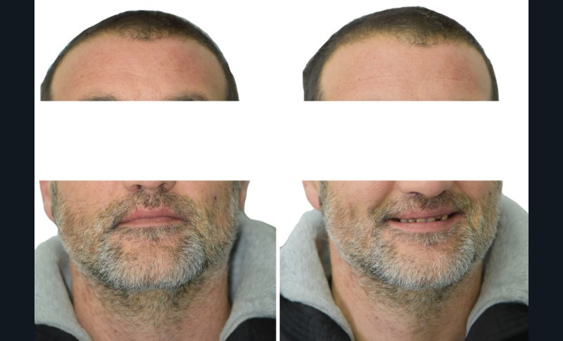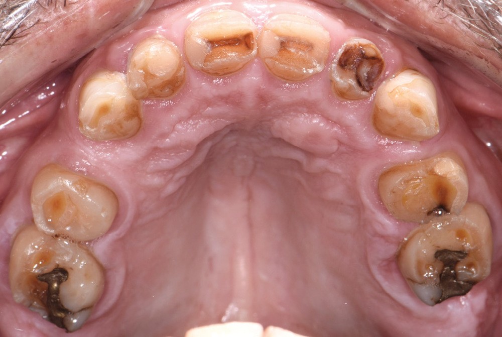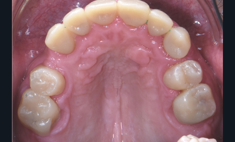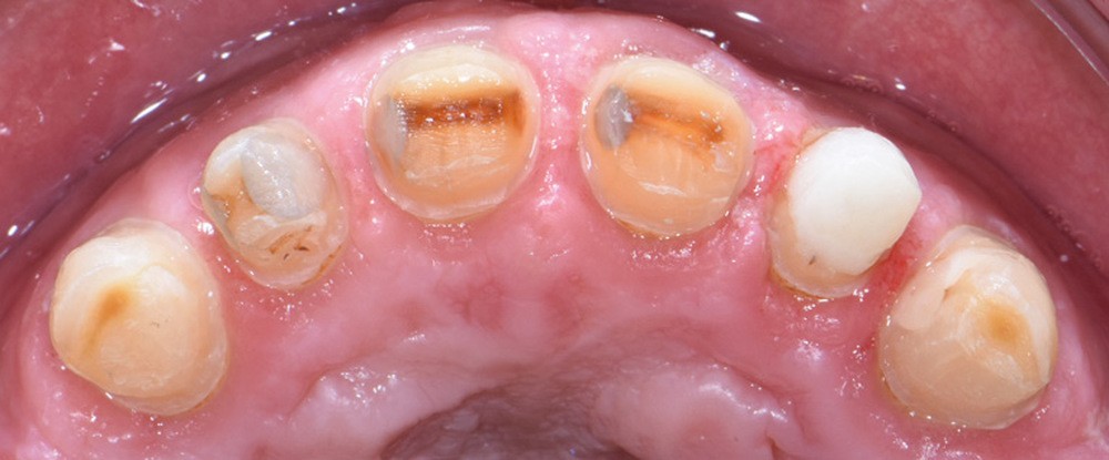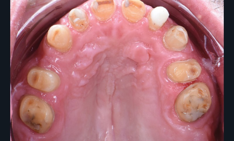 Au vu du contexte para-fonctionnel et de l’étendue de la perte tissulaire, des coiffes périphériques minimalement invasives ont été choisies afin de restaurer l’esthétique et la fonction. Actuellement, aucun consensus n’est fait sur le choix du matériau d’infrastructure à privilégier. Les matériaux hybrides usinables présentent des propriétés mécaniques, physiques et biologiques intéressantes en contexte d’usure sévère (e.g., module d’élasticité, résistance à la propagation de fêlures, facilité de réintervention). Une réhabilitation globale avec remontée de dimension verticale d’occlusion (DVO) par l’intermédiaire de coiffes composites renforcés en nano-céramiques est décrite.