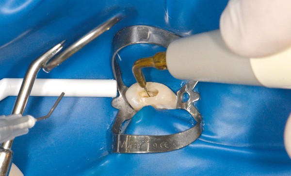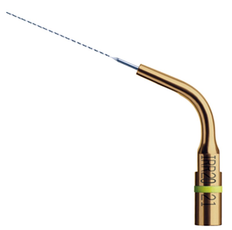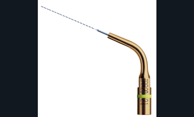 il s’agit d’un insert métallique en acier traité spécialement pour résister à la corrosion. Il est monté par vissage sur une pièce à main ultrasonique et relié à un générateur piézoélectrique. Quatre références sont proposées, en diamètre 20 ou 25/100 mm et en longueur 21 ou 25 mm. Les instruments ont un profil de lime avec une section carrée à angle arrondi. Ils sont stérilisables et réutilisables (fig. 1, 2, 3).