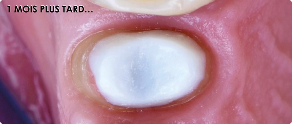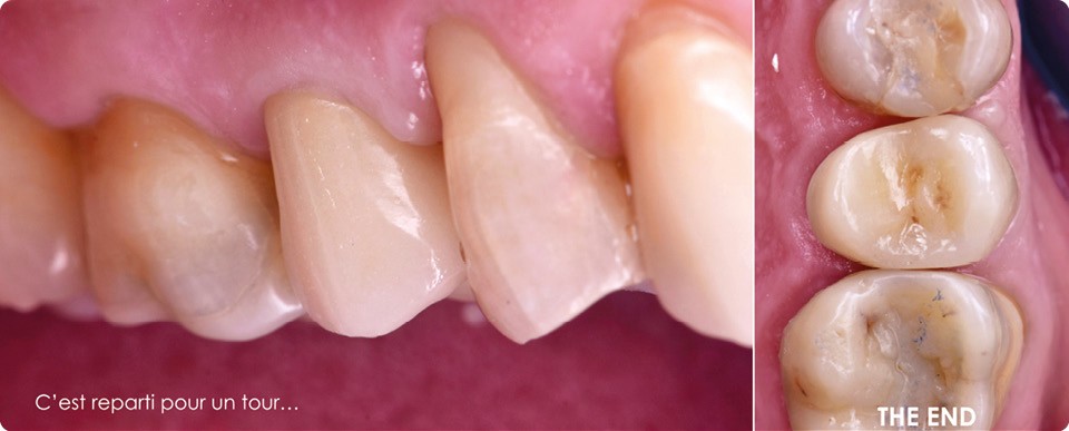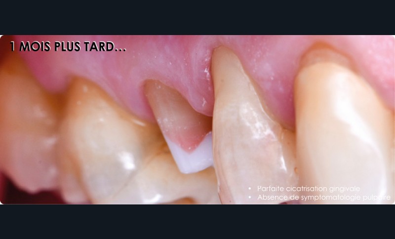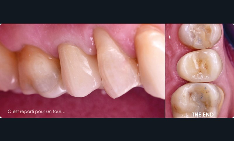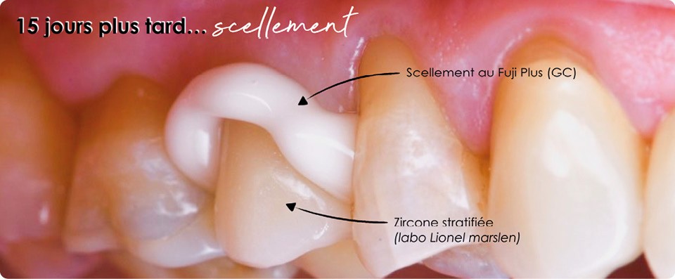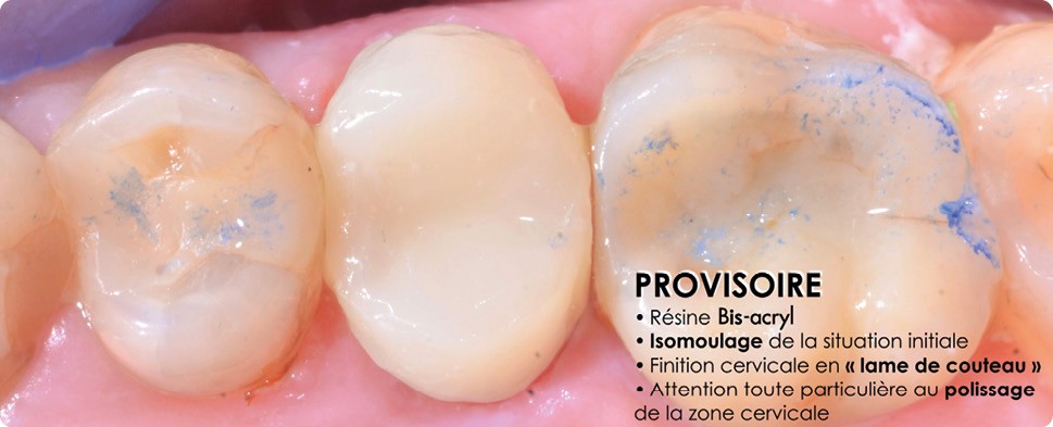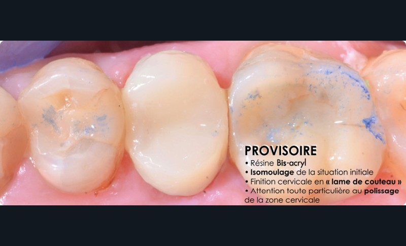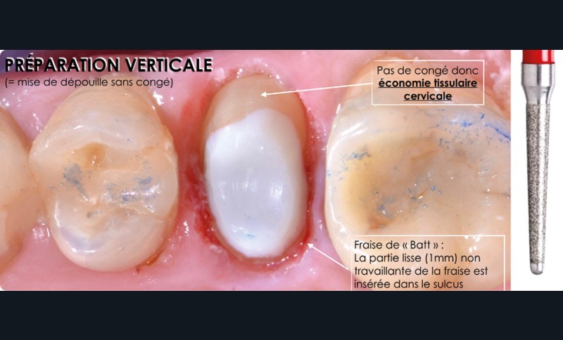 Le cas clinique présenté illustre l’intérêt de ces préparations verticales pour conserver la vitalité pulpaire et récupérer de la « ferrule » cervicale sur une dent pour laquelle une restauration adhésive n’est pas indiquée. Trois rendez‑vous auront été nécessaires. L’une des clefs du succès réside assurément dans la temporisation suffisamment longue entre la préparation et l’empreinte (pour permettre la maturation gingivale).