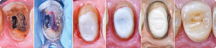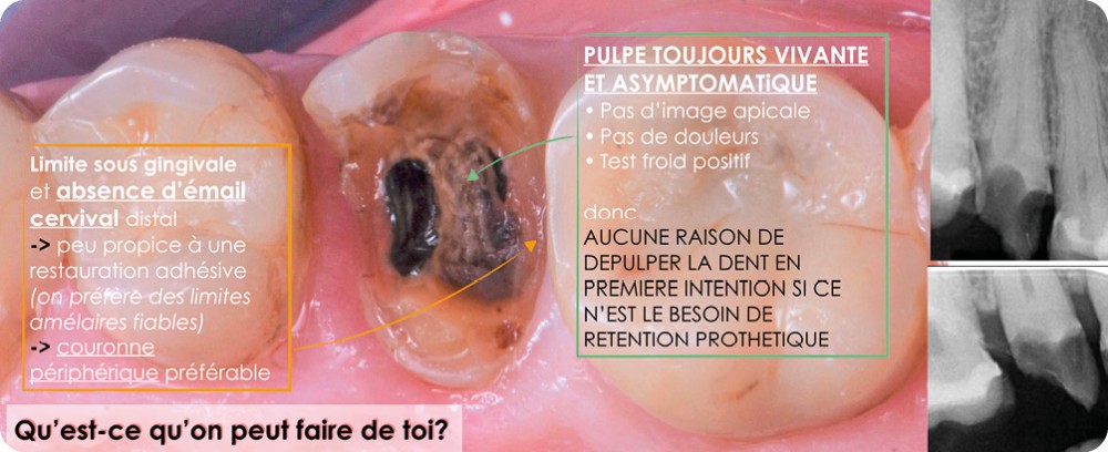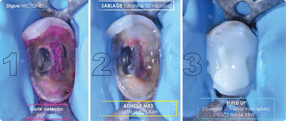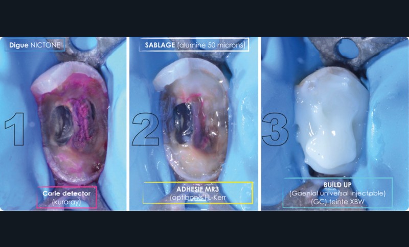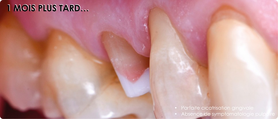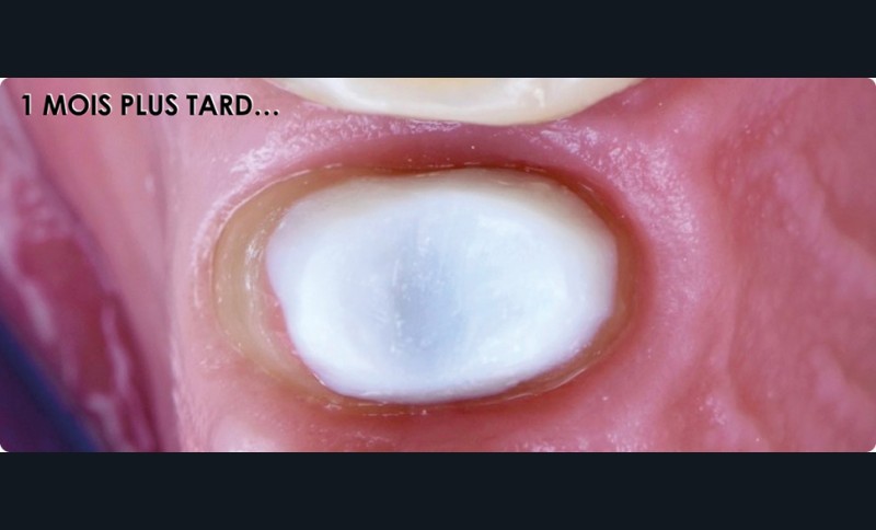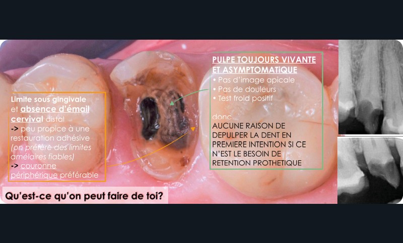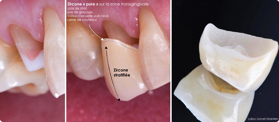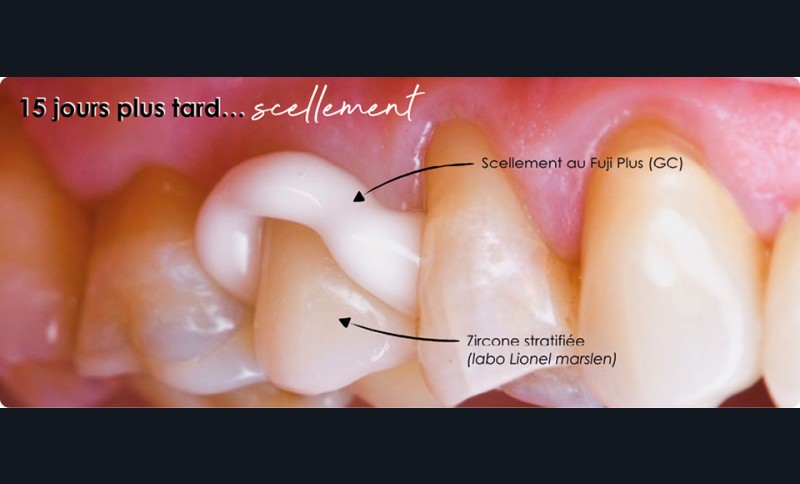 Le cas clinique présenté illustre l’intérêt de ces préparations verticales pour conserver la vitalité pulpaire et récupérer de la « ferrule » cervicale sur une dent pour laquelle une restauration adhésive n’est pas indiquée. Trois rendez‑vous auront été nécessaires. L’une des clefs du succès réside assurément dans la temporisation suffisamment longue entre la préparation et l’empreinte (pour permettre la maturation gingivale).