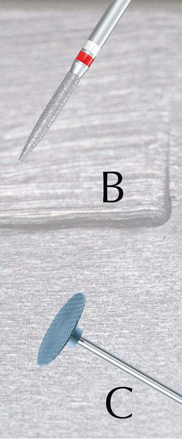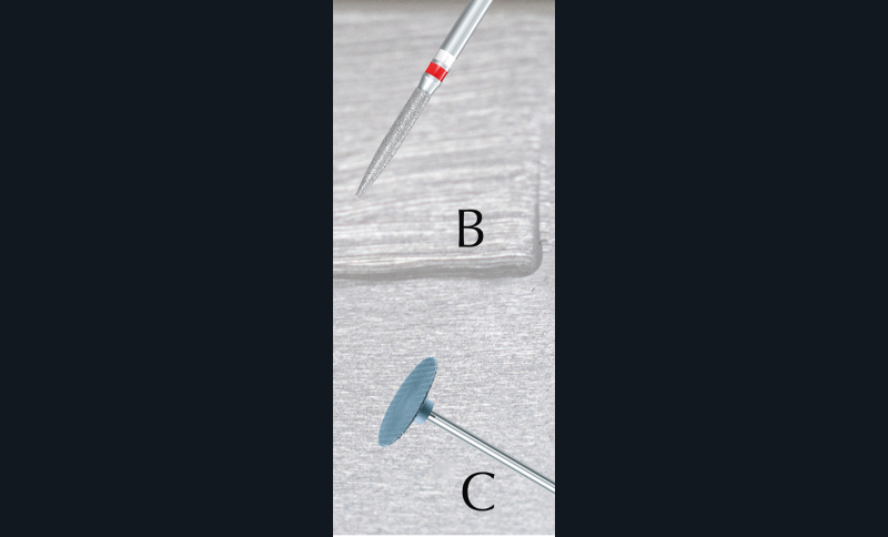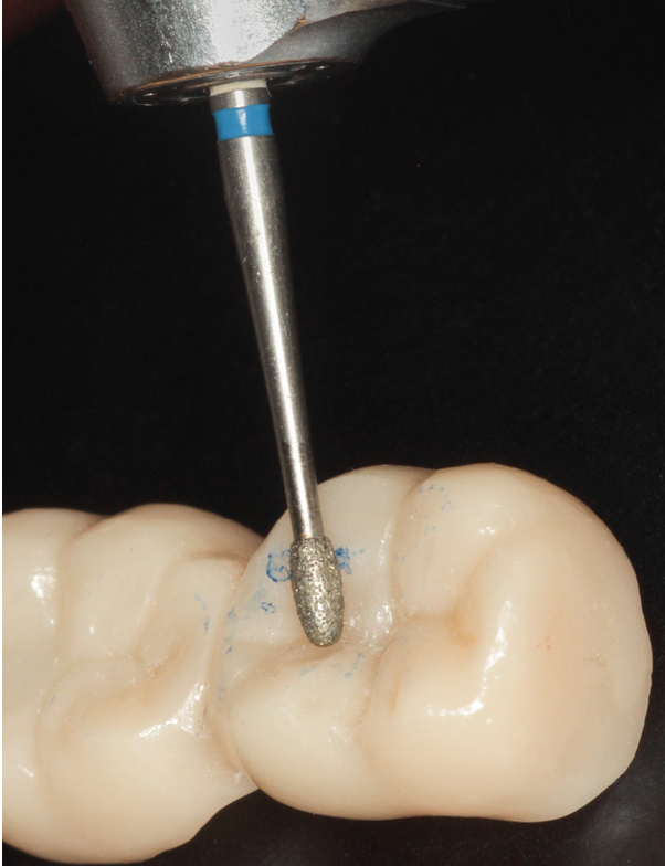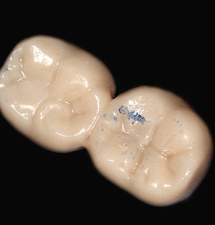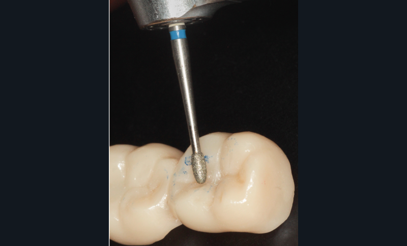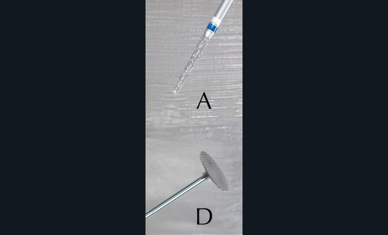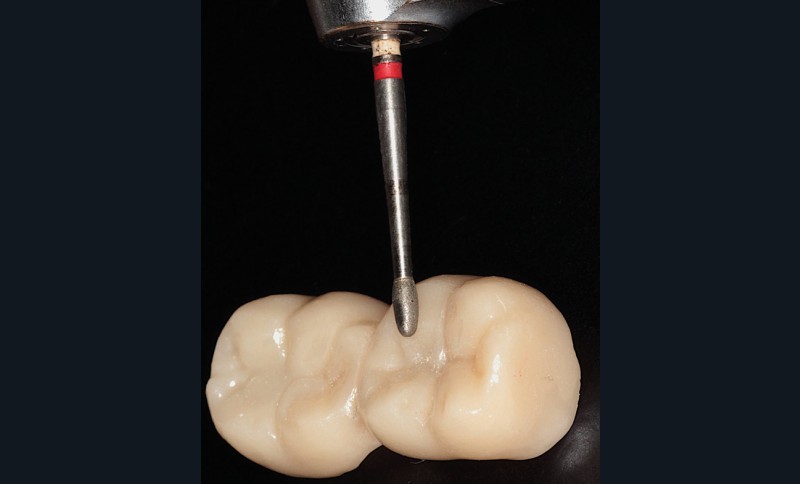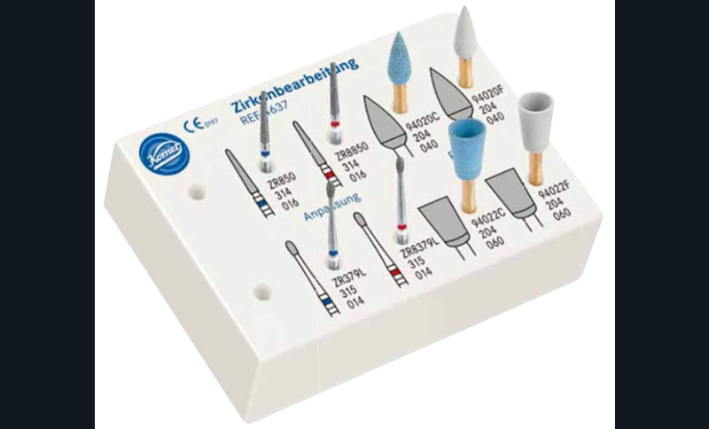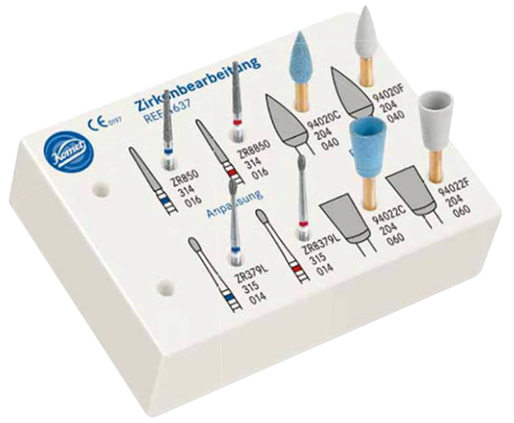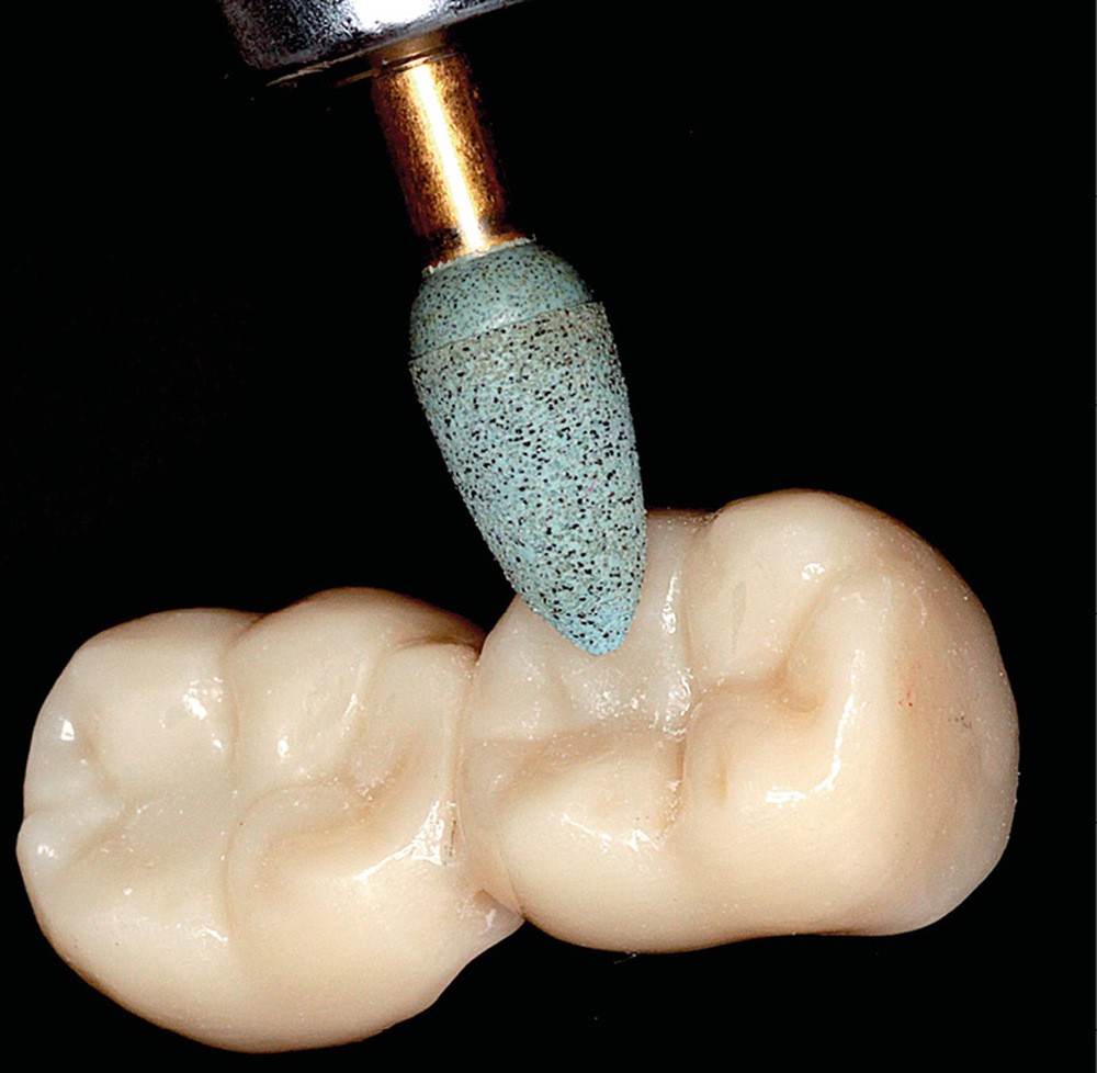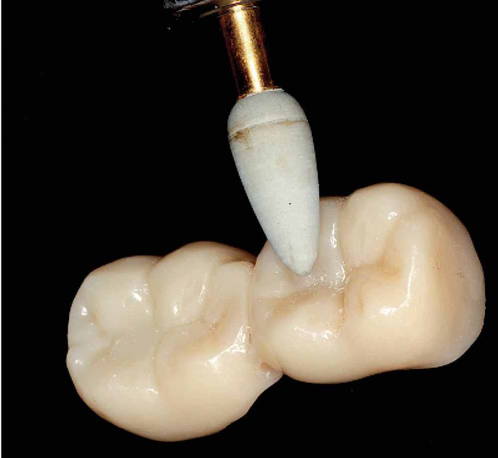 Lorsque les prothèses sont en zircone, ces retouches peuvent présenter certaines conséquences et doivent utiliser une instrumentation adaptée. En effet, la retouche va modifier la structure polie de la surface réalisée par le laboratoire de prothèse. Le passage de fraises pour adapter l’occlusion initie une augmentation importante de la rugosité de surface de la zircone. Si elle n’est pas polie parfaitement, ce dépolissage de la surface de la zircone aura notamment deux conséquences : augmentation de l’usure de la dent antagoniste et initiation d’une zone de fragilisation de la coiffe en zircone. Pour une retouche peu importante, le praticien peut utiliser successivement les fraises ZR850 et ZR379L pour approcher l’occlusion. Une fois les contacts presque obtenus (des points d’occlusion apparaissent sur les dents naturelles adjacentes à la prothèse fixée mais moins dense en couleur), le réglage est affiné avec les fraises bagues rouge et blanche (ZR8850 et ZR 8379L à une vitesse de rotation de 160 000 tours/minutes sous spray). L’occlusion obtenue, le polissage mécanique de surface est fini avec les polissoires (à une vitesse de rotation de 6 000 tours/minutes sous spray) du coffret Komet 4637 (fig. 2). Le temps de polissage est très important pour l’obtention d’un poli miroir [6].