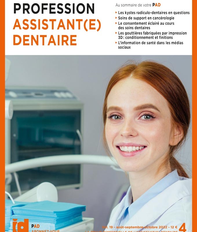 Ces notions de temps, de suivi et d’identité sont fondamentales. Lorsque la maladie (et particulièrement le cancer) atteint une personne, c’est toute sa vie et celle de ses proches qui sont impactées, bouleversées. De l’annonce de la maladie à la prise en charge par les équipes soignantes, l’information et la confiance doivent être là pour permettre au patient de guérir ou d’accepter les séquelles. Cet accompagnement au cours des différents temps thérapeutiques fait l’objet d’un magnifique article proposé par l’équipe de l’Institut Universitaire du Cancer de Toulouse Oncopole. Vous y découvrirez comme moi que les soins de support représentent un soutien précieux pour les patients afin de mieux vivre leur maladie, et que la fonction des assistant(e)s dentaires est omniprésente.