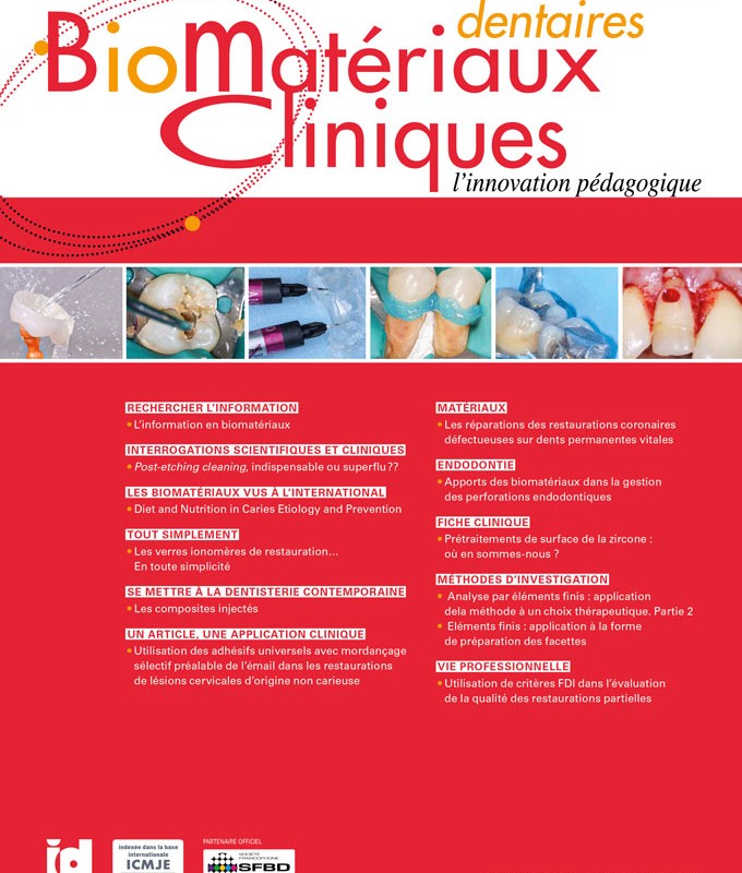 Dans le dernier numéro, nous vous rassurions sur les longs et radieux lendemains de BMC après six ans d’existence, face aux thématiques actuelles explosives (de la CFAO aux biomatériaux minéraux), toutes abordées dans le numéro de mars. Dans ce numéro, vous pourrez apprécier d’autres façons encore de décliner les biomatériaux, via une démarche de plus en plus pédagogique, et donc clinique, tout en conservant la prestance scientifique emblématique de notre revue.