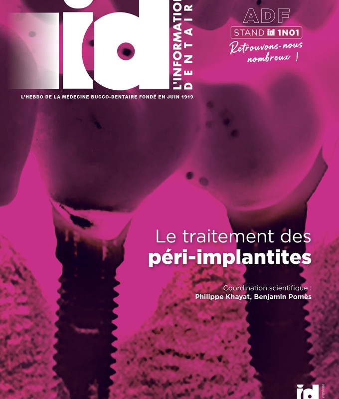 L’Information Dentaire est là où vous avez besoin d’elle. Ce numéro spécial sur le traitement de la péri-implantite était nécessaire dans un contexte de grandes incertitudes concernant le traitement de cette maladie. Nous avons tenté de vous apporter quelques pistes de réflexion avec l’aide de Benjamin Pomès, praticien hospitalier co-directeur d’enseignement avec Mickaël Samama et Alice Guyon du DIU de réhabilitation orale implantaire de la Pitié-Salpêtrière, avec les rédacteurs en chef, Michèle Reners et Michel Bartala, enfin avec nos auteurs David Aidan, Urs Brodbeck, Olivier Carcuac, Romain Castro, Aurélien Delaunay, Dov Derman, Myriam Derman, Jean-Louis Giovannoli, Tarik Kabli, Corinne Lallam, Romain Lan, Markus Schlee, Muriel Wnekowicz, Holger Zipprich.