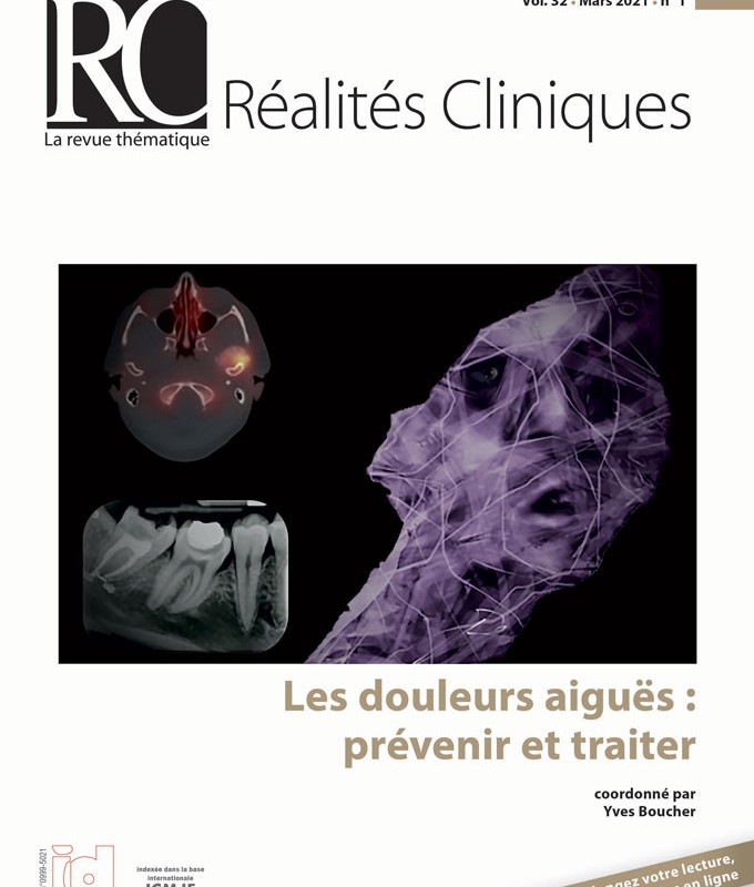Le sujet étant trop vaste pour un seul numéro, nous avons choisi d’axer celui-ci sur la douleur aiguë en sélectionnant certains aspects rencontrés fréquemment en omnipratique : l’anxiété et l’anesthésie, deux éléments majeurs de notre relation et prise en charge thérapeutique, notamment en situation d’urgence ; les douleurs infectieuses endodontiques et parodontales, qui sont les douleurs orofaciales plus fréquentes ; les douleurs muqueuses et leurs spécificités ; la douleur chirurgicale, au cœur de notre métier ; certaines difficultés diagnostiques illustrant la médicalisation de la profession et ses interactions avec d’autres disciplines telles que la neurologie ; le lien entre douleurs, ATM et occlusion, autre sujet d’inter-action avec la communauté médicale depuis Costen ; les efforts faits pour transcrire l’expérience du patient et l’objectiver au cœur de la problématique diagnostique ; la démarche d’imagerie intégrée aux investigations diagnostiques.