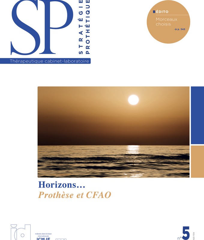 Nous avons choisi de réaliser un numéro classique, composé d’articles concernant la prothèse sous toutes ses formes, qu’elle soit clinique ou de laboratoire, conformément aux objectifs de la revue. Cerise sur le gâteau, nous y avons ajouté un florilège, un recueil de morceaux choisis. Trois publications le composent, parues récemment dans des revues du groupe ID ; elles ont retenu notre attention pour leur qualité et leur intime relation avec le domaine prothétique. Ces articles sont issus de L’Information Dentaire, de Réalités Cliniques et de BioMatériaux dentaires Cliniques.